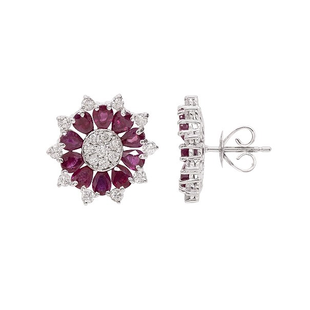 Brinco em Ouro 18k Branco Flor Com 36 Diamantes 0.87cts Com 20 Rubis 4x3mm 4.40cts