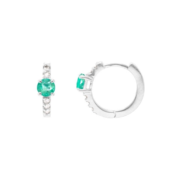Brinco em Ouro Branco 18k Argola com 10 Brilhantes e 2 Esmeraldas 3mm